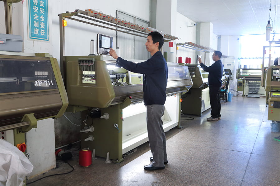 أكثر من 100 ماكينة حياكة مسطحة مستوردة بالكمبيوتر، بإنتاج يومي حوالي 70,000 قطعة.